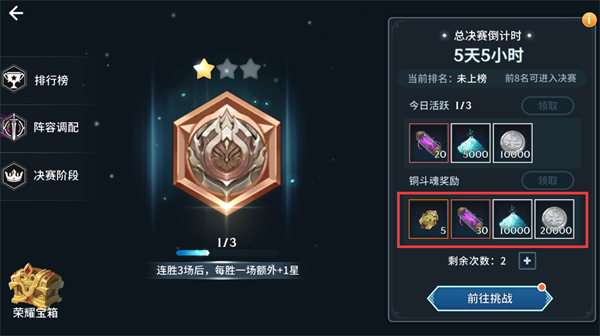 最基本的竞技玩法,每日有五次竞技机会,每次胜利和升段会获得物品奖励。目前段位分为铁斗魂—>铜斗魂—>银斗魂—>金斗魂—>紫金斗魂—>蓝宝石斗魂—>红宝石斗魂—>钻石斗魂。