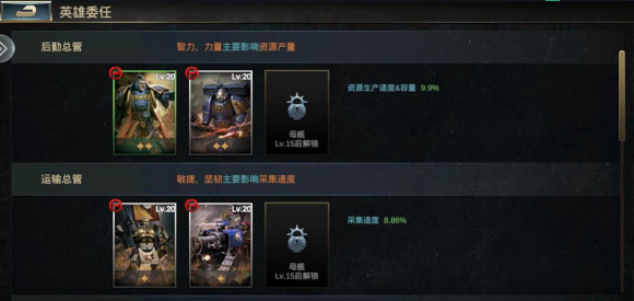 为什么说英雄并不是最重要的呢?毕竟英雄的养成速度比较慢,除了对远征战斗有帮助外,在其他的战斗下,相邻等级的英雄差距并不大,所以在游戏中可以放慢对英雄的培养,优先扩充基地内的兵力,增添更多建筑才是更重要的,毕竟在星图中可收集的物资与战斗的收获要远远高于远征的。当然英雄并不是一点也不重要,在基地中玩家可以给英雄任职,根据英雄不同的属性搭配职位会获得额外的效果,例如后勤总管会根据任名的英雄来提高资源生产的百分比。毕竟有了资源才有更多的可能。