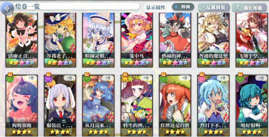 绘卷在游戏中的作用也十分强大,是画有幻想乡的风景、道具、人物和情景的卡片,能被装配在符卡上为角色提供各种好处。可以进入伙伴页面插入到游戏对应的角色中以提升角色的伤害等属性,相同的绘卷也可以合成提升等级,绘卷星级越高属性越好。