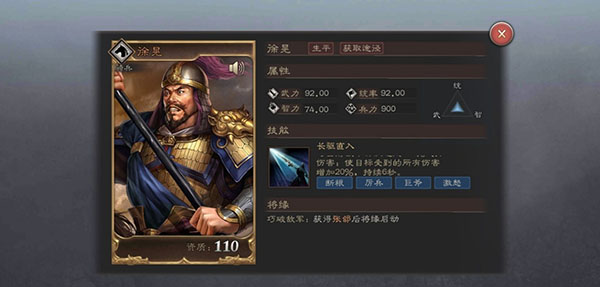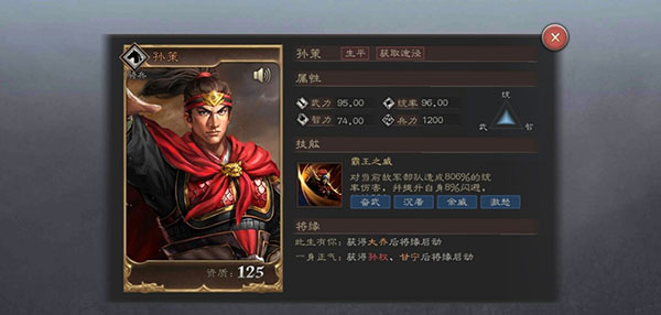 孙策在进行8次攻击后,能够降低当前敌方部队50点怒气,并且自身会获得50点的怒气回复,与闪避回血的机制相似,都是十分“拉仇恨”的存在哟~在自身死亡后,还可以提升己方全体武将的护甲和攻击,这种“舍我其谁”的精神,实属难得呀!满星时的“激怒”,让孙策在开局即刻获得180点怒气,使其更快地释放技能。孙策的技能属性卓越,阿蝉推荐主公们将其升至满星,以获得最大程度的提升!