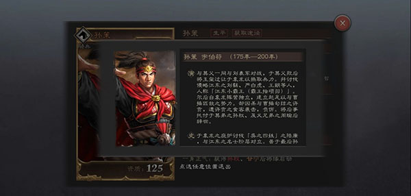 孙策为破虏将军孙坚长子,东吴开国大帝孙权的长兄,东汉末年割据江东一带的军阀,乃汉末群雄,孙吴政权的奠基者之一。早期为了继承其父孙坚的遗业而屈事于袁术。兴平二年(195),孙策征得袁术许可,东渡长江,进攻樊能、于糜,随后又袭击了张英。并以曲阿为据点,与扬州刺史刘繇进行决战,大败刘繇。随后孙策准备发兵北上,在丹徒狩猎时,为许贡三门客所伤,英年早逝。在孙权接掌孙策势力,并于称帝后,追谥孙策为长沙桓王。