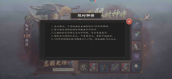 好啦~以上就是本期内容了!相信主公们对于“江东小霸王”孙策也有所了解,兼顾伤害、回血和辅助能力于一身的无双武将,谁人不爱呢?【限时神将】活动现已开启,现在进入游戏点击主界面右上角【限时神将】参与抽奖活动,保底抽取18次必得125橙将孙策哦!活动马上就要结束了,各位主公还不赶快去试一试自己运气如何,阿蝉祝愿主公们都能早日拥有他~
