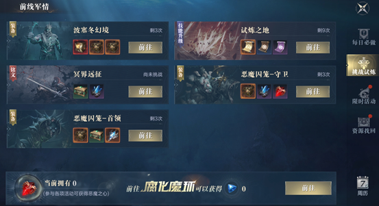 每天上线“每日必做”“挑战试炼”以及“限时活动”三个板块的副本,我反正是一个不落的全做了,以此来获取资源提升实力。