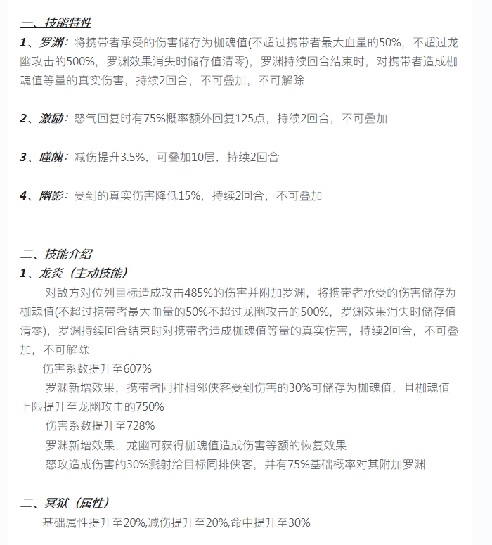 龙幽是魔界八国之一夜叉国的二皇子,亦身负幽煞将军之职。只可惜,他最终还是回归魔界,与小蛮自此分隔两界。接下来,我们先一同了解罗渊、激励、噬魂、幽影等buff;再认识他的技能介绍、技能解读与专属仙术;最后我会提供对应的加点思路及阵容搭配,大家好我是慢热现在带大家深入认识这位幽煞将军。