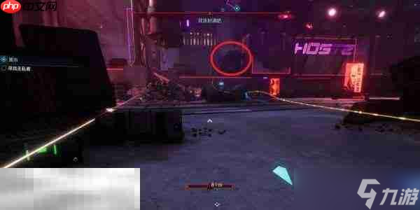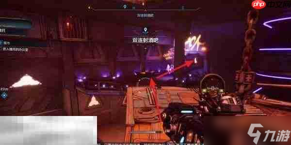 靠近酒吧门口的门铃并互动,得知需获取特定日志才能进入。随后离开原地,向前直行,并从下图红圈标注的位置跳入目标建筑物内。