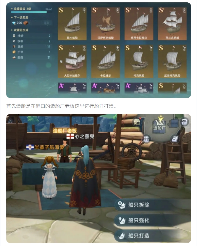 今天给大家带来的是船只打造的攻略。作为一个航海游戏,船只当然是最重要的部分,建造新船不仅好看,而且属性更好,可以帮助我们更好的海战,贸易或者竞速。有一个S的船只哪怕换了新船也可以收藏起来,获得不错的属性加成。所以大家能换船的时候还是要尽快换船,而且争取换艘好船。