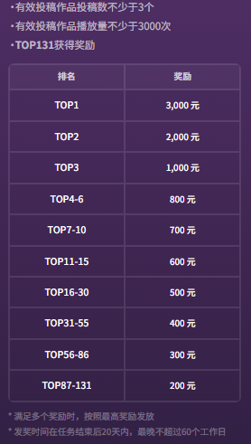 6、单个作品播放量不低于1000,可获得参与资格
