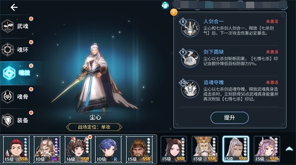 剑道尘心,小说中的尘心拥有七杀剑武魂,拥有极为强大的攻击力。游戏里也秉承了这一设定。尘心的主动技能和武魂真身都是极致的单体伤害,武魂真身还拥有长达三秒的眩晕效果,可谓是极度强悍。