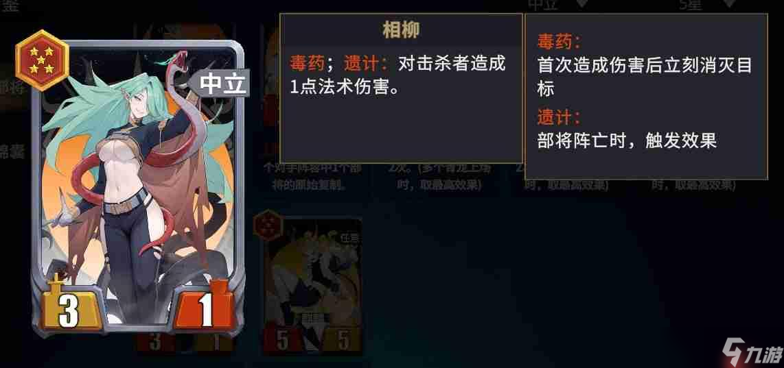 专治大哥,但注意圣盾王翦会先开盾再触发遗计,普通相柳无法毒杀,需金卡相柳才可破解