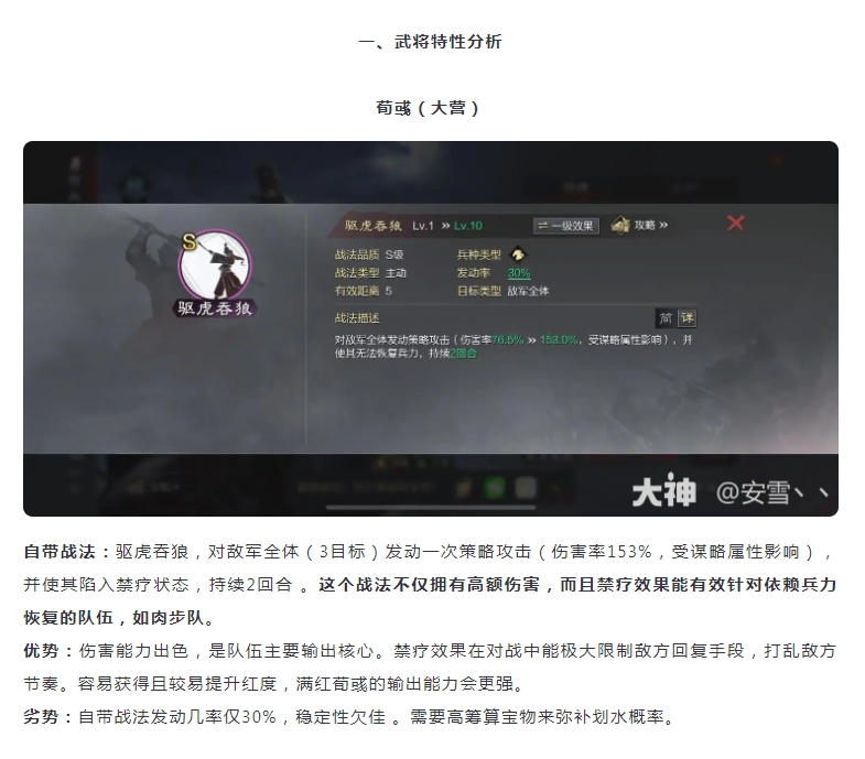 比如荀彧,自带战法:驱虎吞狼,对敌军全体(3目标)发动一次策略攻击(伤害率153%,受谋略属性影响),并使其陷入禁疗状态,持续2回合。这个战法不仅拥有高额伤害,而且禁疗效果能有效针对依赖兵力恢复的队伍,如肉步队。