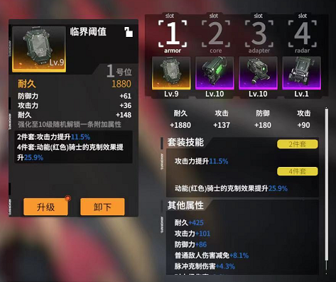 在装甲上潘朵拉[S]作为支援型不像黛西、蜜雪儿这些带有冷凝、感电异常状态效果。所以潴潴还是比较推荐使用【临界阈值】的,直接对动能(红色)怪物起克制作用,提升攻击效果。