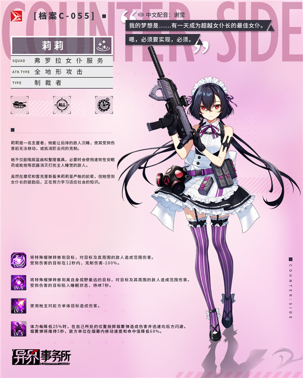 莉莉,外号昏睡女仆,3费辅助制裁者,是本季的季票角色,黑发红眼,外表给人一种冷酷的感觉。事实上,在摩尼和雷克里斯眼中,莉莉确实是个非常严格的前辈,不过她在女仆长的鼓励下正在试图改变,用摇篮曲来代替昏睡瓦斯会不会显得温柔些呢?