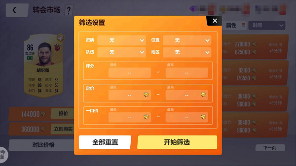 接着往下说。点击带有“转会市场”字样的橙色区域进入上图所示界面,其中“资质”一栏为选择球员卡的下限,也就是说如果选择银卡,那么银卡及以上的球员都会出现;若选择紫卡,那么就只会看到市场上的紫卡品质球员。如果只想购买某名特定球员,那么也可以点击叉子关闭此页面,然后在“输入球员名称”一栏内直接输入球员姓名即可看到市场上有无自己想要的该名球员。