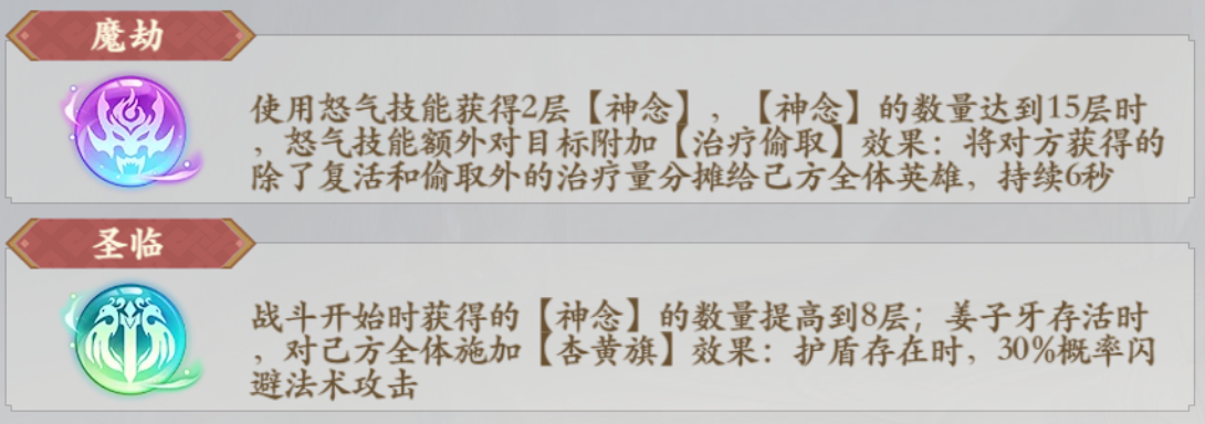 4.魔劫技能:使用怒气技能获得2层【神念)【神念】的数量达到15层时怒气技能额外对目标附加【治疗偷取)效果:将对方获得的除了复活和偷取外的治疗量分摊给己方全体英雄,持续6秒;