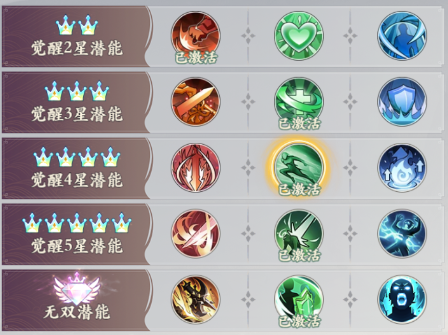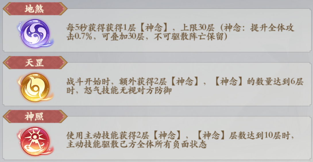 3.神照技能:使用主动技能获得2层【神念】【神念】层数达到10层时主动技能驱散已方全体所有负面状态;