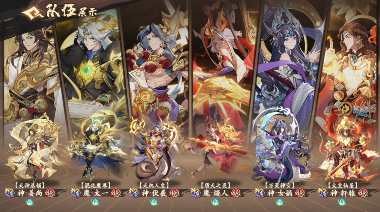 神魔:神·伏羲,魔·燧人,神·轩辕,魔·太一,神·女娲,神·姜尚,双辅助,前排战坦抗伤,保护太太一无敌输出,唯一的真神阵容!