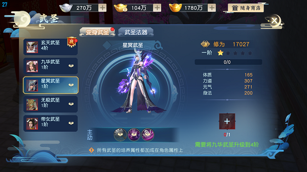 独立于主技能以外特殊技能,自成一个特色系统。当主角通过等待自动恢复怒气以及主技能释放恢复怒气等途径,使怒气值满格即可激活武圣技能释放条件。主角变身作战,大幅增加战斗力,并且独立产生武圣自主技能,不同武圣自带技能不同,增益方向不同,并且有可通过活动来获得武圣法器,增加对应属性。在整个养成路线上武圣都是一个比较重要的支线,真可谓之千钧一发之际的保命甚至反杀手段的上上之选。