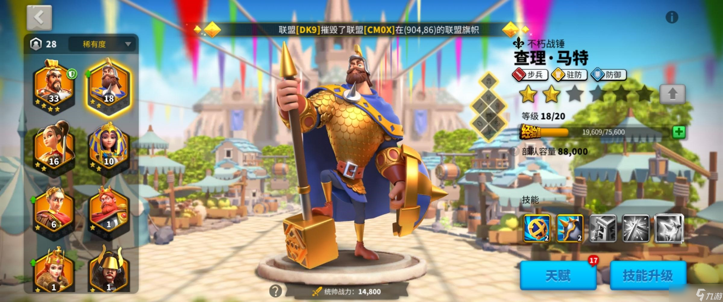 如果想调整守城武将,直接点击城墙图标,选择第三个功能界面,顶部会显示当前驻防的主将和副将。点击头像即可更换,主将能触发驻防天赋,副将仅生效技能。推荐优先选择理查、查理、孙武等适合驻防的武将,他们的技能能有效提升城池防御能力。注意更换守城武将不需要消耗道具,但需要提前培养好替补武将的等级和技能。