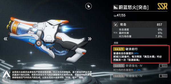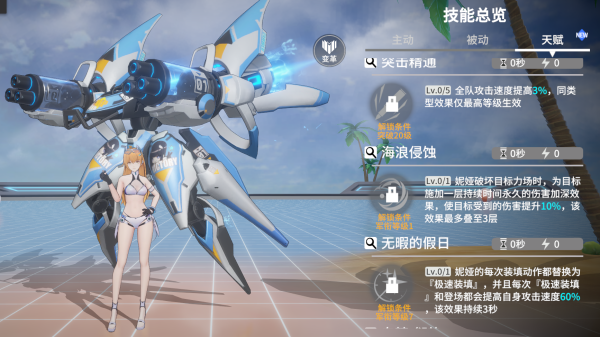 被动2【驭浪射击】:登场时获得普攻提升buff,三级有72%的普攻提升,效果比较可观。且完美装填能够刷新效果,一般情况下可以保持BUFF不间断,高效提升战斗力。