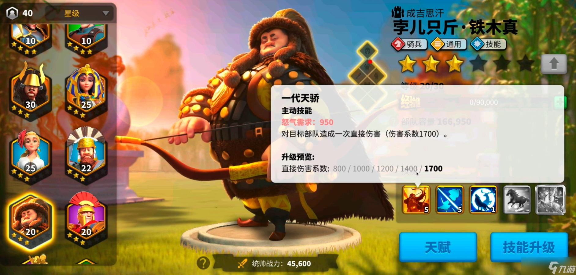 培养铁木真时,优先升级他的主动技能一代天骄,这是主要的输出手段。天赋加点建议侧重骑兵和技能系,提升伤害和怒气回复。如果用来野战,可以点出机动天赋增强支援能力;若是集结攻坚,则强化输出和生存。他的觉醒技能有概率触发二次攻击,进一步放大爆发潜力,但觉醒需要大量金头,建议优先攒资源。