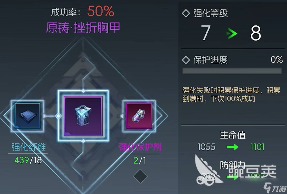 同时,装备还可通过强化进一步提升它们的属性,所需消耗的资源强化纤维可在副本等玩法中获取,装备的强化等级越高,再次强化时需要的强化纤维数量也就越多,并且在高强化等级时有概率会出现强化失败掉级的情况,但可使用强化保护剂来阻止掉级,还能为装备积累强化保护进度,满值时再次进行强化百分百能成功。