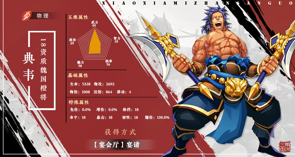 根据原型游戏内定位物攻型,武将初始资质为18,为魏国橙将英雄,擅长使刀,喜好古董和小吃(主公游戏中送礼后会相应加成以及随机收到武将回复的小惊喜哦~)