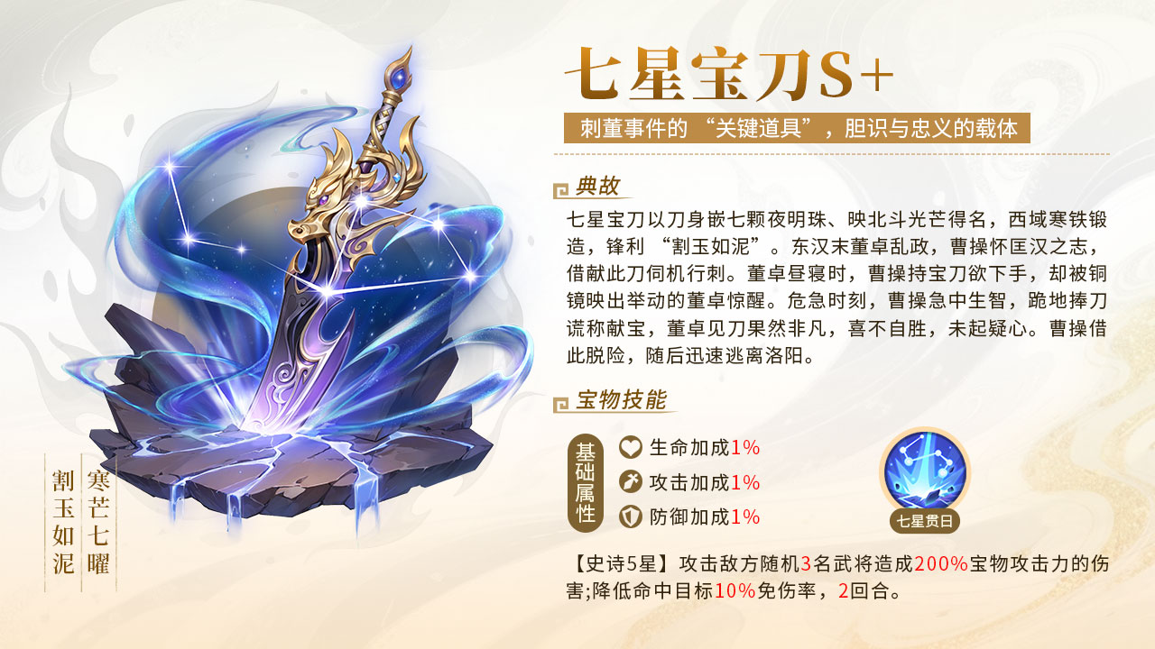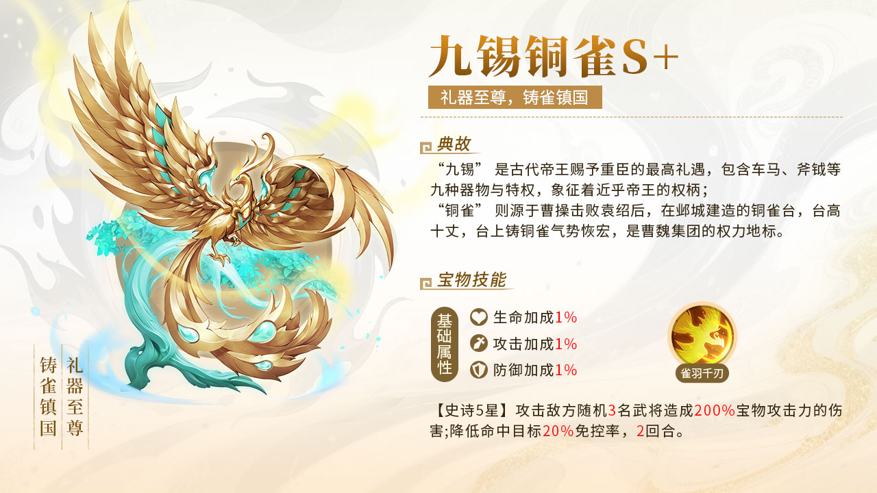 以上介绍仅为宝物风采之冰山一角,宝物的介绍融汇历史典故、民间传说、艺术想象与策略平衡,但是它的真正效果,还需各位主公在游戏中亲身体验;最终的设定与效果,请以游戏内实际展示为准哦!