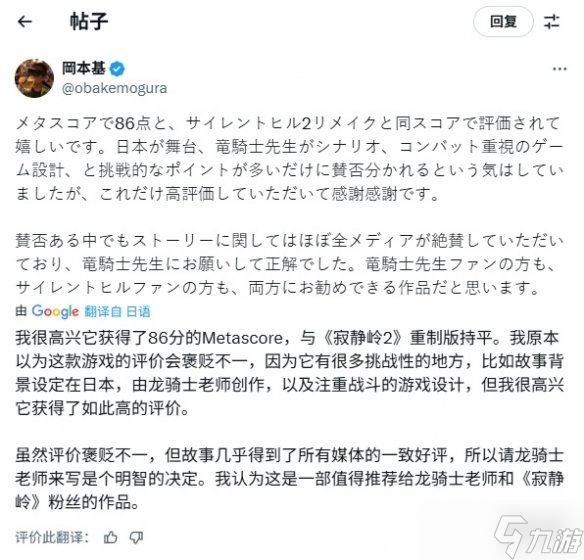 他讲道:“我很高兴本作拿到了86分,和《寂静岭2:重制版》一样。以日本为故事舞台,由龙骑士07撰写剧本,再加上以战斗为核心的设计,我原本预计可能会引发不同看法,但非常感谢能获得这么高的评价。”