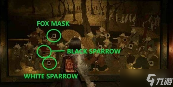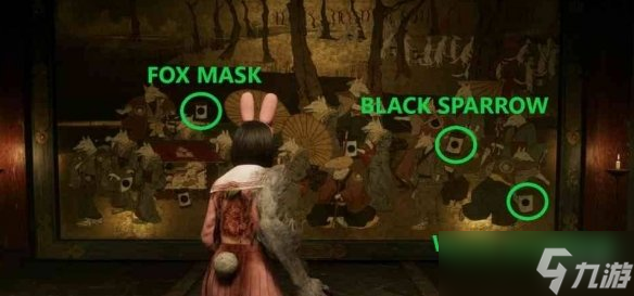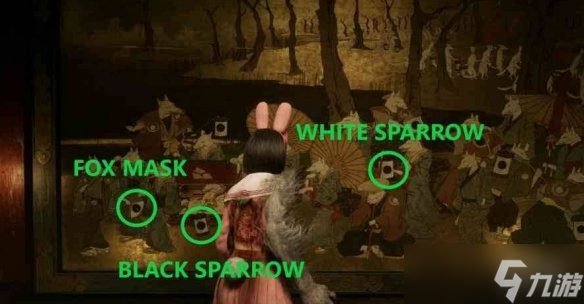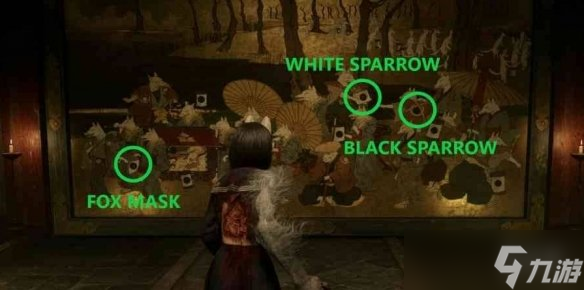 游戏《寂静岭f》壁画谜题是结局触发需要玩家将狐面、白雀、黑雀三枚纹章根据目标结局对应的图案布局嵌入壁画空位。每个结局的纹章放置位置和匹配的狐狸行为图案完全不同,需严格对照图案细节完成镶嵌。