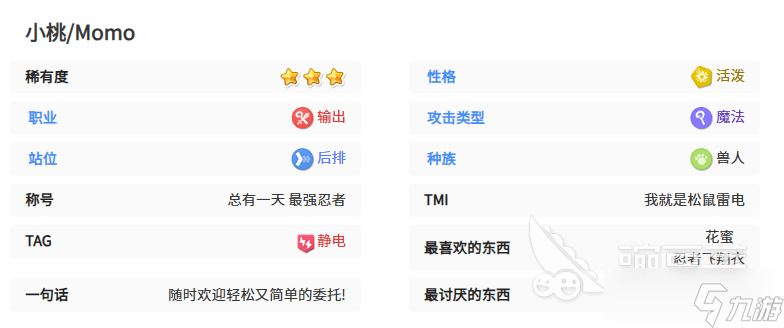 小桃的喜好还是会很有意思的。一直都会觉得油炸空气条是忍术做的,所以就会一直去研究。松饼更是厌恶,会认为这是忍者的训练道具。而只有酸酸的vc,还有甜甜的vc,就会比较喜欢。那些热乎的年糕根本就不敢趁热喝,必须要等到吹凉了之后才敢吃,确实是一个很可爱的细节。定位于后排主打的就是魔法攻击,性格是比较开朗的,真的很难让大家不喜欢。作为忍者所喜欢的那就是一罐花蜜,每一次看到花蜜眼睛都会发亮。