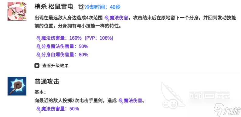 梢杀 松鼠雷电这就是大招很厉害,可以直接闪到位置最远的敌人附近。然后打出4次范围性的魔法伤害,每一次伤害可以高达160%。不过进入到pv p就会有所下降,一般是下降到106%,在打完之后根本就不会浪费时间,还会留下一个和小技能一样的分身。所以这一个技能不仅可以打出伤害,更具有保命的效果,就是非常典型的忍者打法。当然平时的普通攻击也并不会没有任何的实力,如果把手中的剑扔出去,那每一次都可以造成50%的魔法伤害,持续的输出还是比较稳定的。