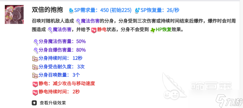 小桃从技能方面来看,输出的套路也是很有讲究的。双倍抱抱是一个很实用的技能,一开始只要225点sp,基本上每一秒都可以回26点sp。一旦在释放之后就可以召唤三个分身,这些分身很厉害,还可以随机去打敌人,每一个就会造成50%的魔法伤害。而且抵抗三次或者是12秒之后就会直接炸掉,爆炸的伤害就可以达到80%,与此同时也会给敌人挂大概两秒的静电。无论是减速度还是减攻击,都会拥有较好的效果,不过需要注意的就是分身根本就没有办法回血。
