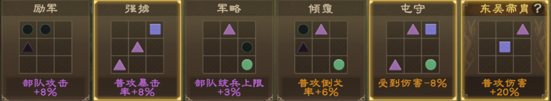 当士兵在九宫格中的站位与形状,符合下面小项的站位条件时,对应的形状便会被点亮,最后被激活。