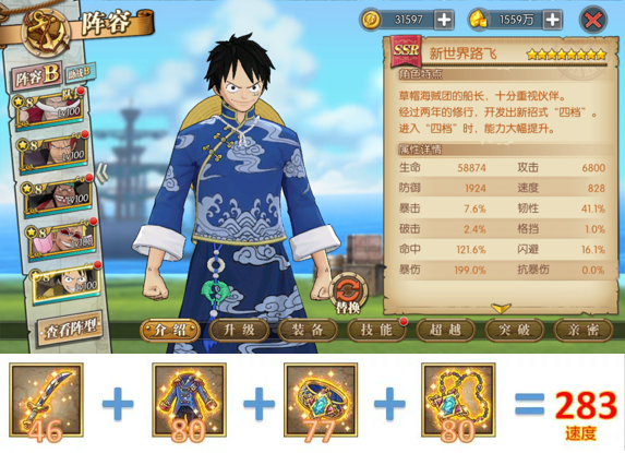 战斗总结,如果新世界路飞使用的装备是上述的100级【凯旋套装】,那么这场战斗的胜利似乎会变得更加顺利。速度本就不低的新世界路飞,在使用极品凯旋套的情况下,光是面板速度就高达828点,进入战斗后的天赋加速配合四件套属性可以为他提供尽快近乎3块10级速度宝石的效果,以及20%的伤害加成和命中;再结合二件套属性的命中,新世界路飞可以为附魂和装备空位省出命中的位置!让自己的输出加成集中到暴击/暴伤/正义宝石上!