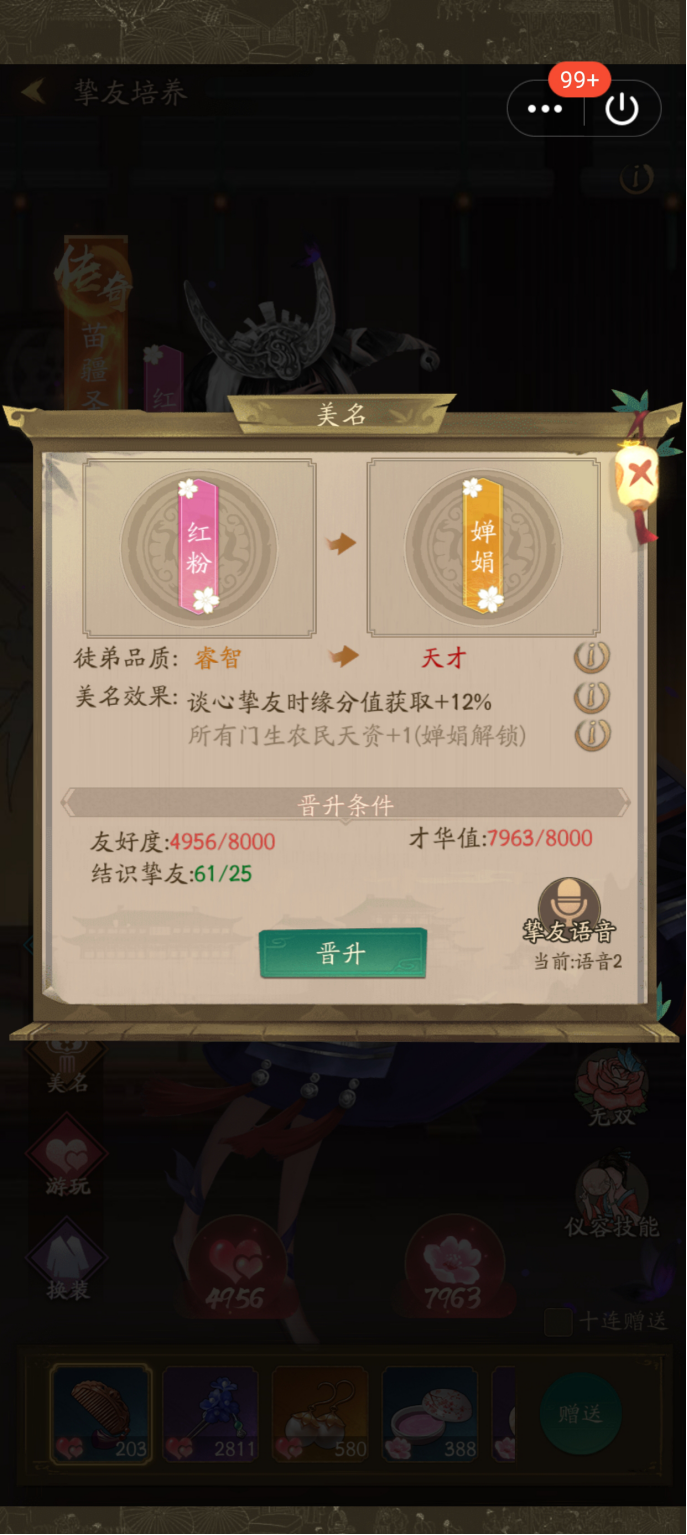 优点:很多人开局是苗疆+屠夫,转这个门客的优势是挚友共享苗疆和千仞雪,不影响发育挚友便宜,零氪也可以3-5挚友,相对于五艳或者其他门客来说更好拿挚友(前期没什么,后期大家也发现了挚友的数量影响有多大,一个挚友的加成可比几千资质丹多得多)杨戬/唐三跟屠夫/李香君/张三丰同时共享2两个挚友,说明我们主养一个门客的同事带动了三个门客白嫖战力十五个挚友位置还有10个位置,咱们可以养士的大门客韩立,侠的大门客兰飞(挚友都放出来也才8个位置,完全不影响)然后+孙膑(主要考虑是农队,还跟兰飞共挚友也就不会浪费挚友位)