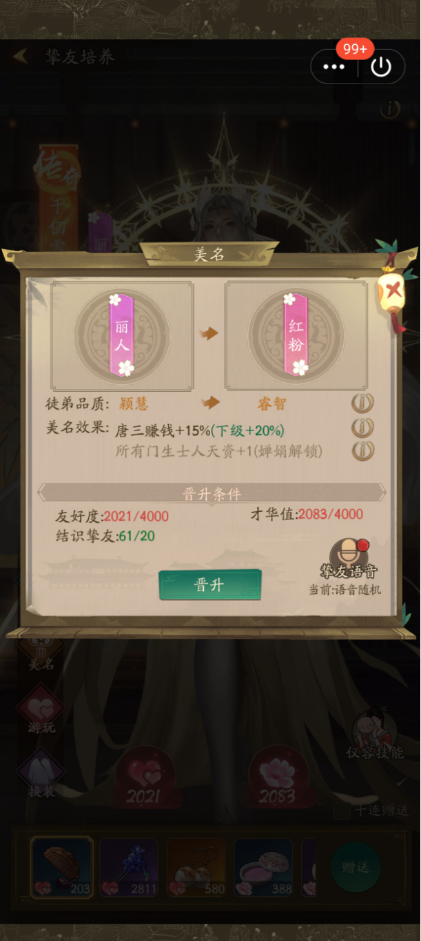 挚友4小舞美名是加门客百分比的,三天元宝拉满能概率白嫖,三天6块(运气不好的三天6+6)就能拿下,主打一个便宜有用