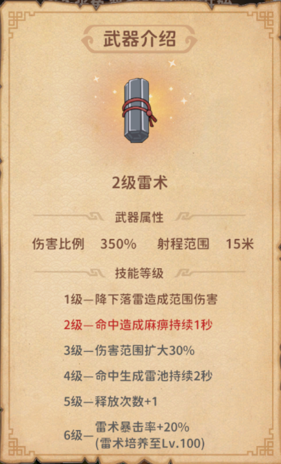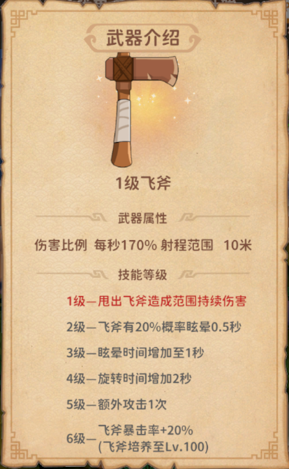 武器的类型共有八种,分别是飞斧、长枪、石头、长弓、雷术、短刀、滚木、夜光珠,大部分的武器所需占用的格子数不同。如飞斧所占用的是“倒7”字型的格子,对此开局随机到飞斧的话,建议用飞斧和雷术、石头、夜明珠搭配,这样子可以最大化利用格子。