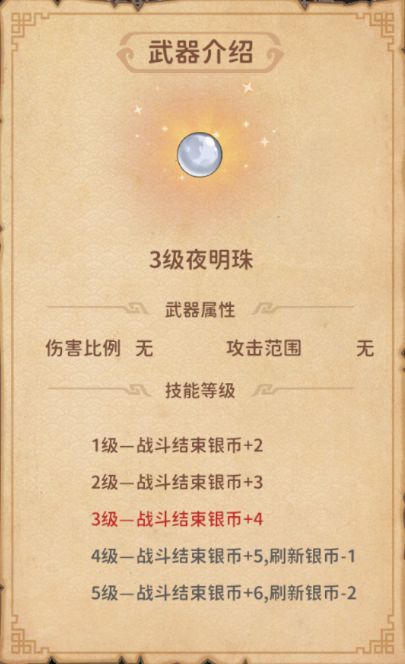 从武器效果上来看,夜明珠是属于辅助性武器,不具备任何伤害效果,但是可以提供银币收益以及降低刷新硬币的消耗,所以不适宜太多,适量就好,后期硬币数量足够的情况下,甚至可以考虑替换成石头。