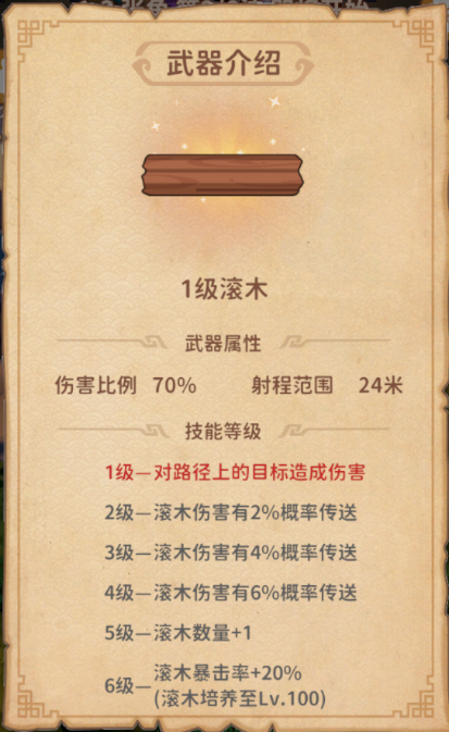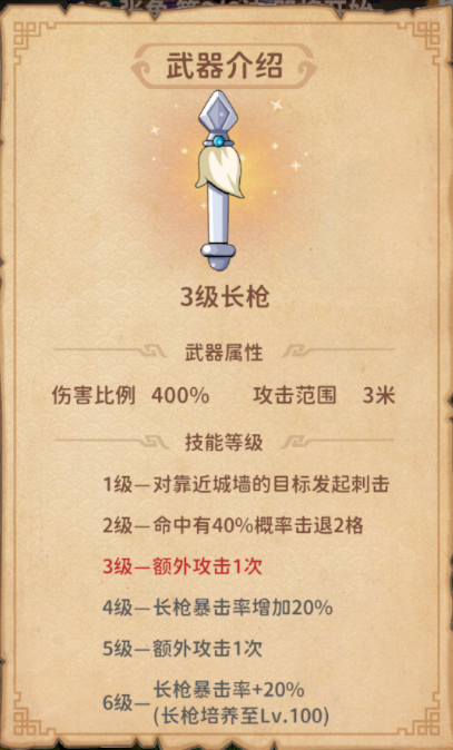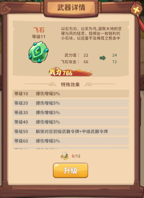 每次通关可以获得一定数量的“武器”碎片,除了夜明珠外,其余武器可以在武器界面进行升级。武器升级后可提升攻击,达到一定等级还可以解锁武器令牌以及触发对应系的武将技能。