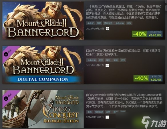 《骑马与砍杀2:霸主》原价248元,-40%,148.8元(史低-50%,124元)