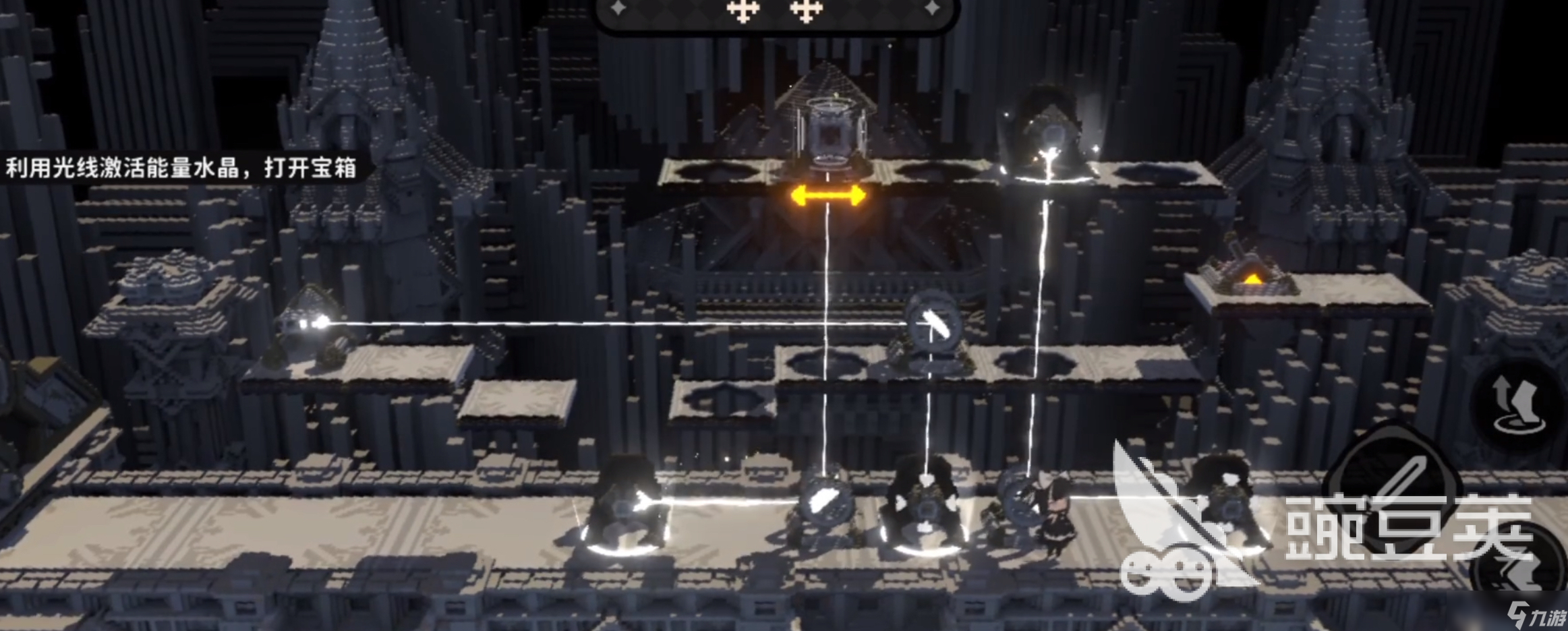 第3关海恩城,进入地图之后,直接来到第二个交互点,镜面翻转光线朝上,并把机关下沉方便之后的跳跃。接着来到第三个交互点翻转镜面使光线朝右,并将黄色平台下沉。然后跳跃到最高的平台交互点,调整镜面将光线朝左,之后跳下来将黄色平台上升和第三个平台对齐就可以了。第4关晶石营地,进入地图之后来到最后一个交互点,翻转镜面使光线朝上。然后调整黄色机关让平台上升,之后跳到和黄色平台平齐的平台,翻转镜面使光线朝上,这关就完成啦!