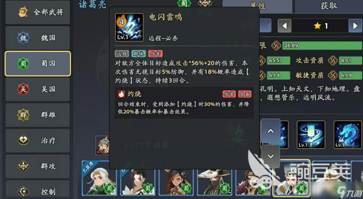 对于诸葛亮的技能特点我们可以先知道的是他本身是一个属于蜀国阵营的一个角色,并且属于群攻型,能够对敌方进行大范围伤害,而且他本身的资质也是十分出色突出,他第一个技能名字叫做电闪雷鸣,属于远程伤害类型,能够对敌方的所有单位目标都造成伤害,并且在输出的时候,他是直接无视掉对方的部分防御的,有一定的概率对敌方造成灼烧并持续三个回合,在受到灼烧的时候,敌方会持续不断的受到伤害直到回合结束,并且本身的暴击率和暴击效果也会直接降低20%。