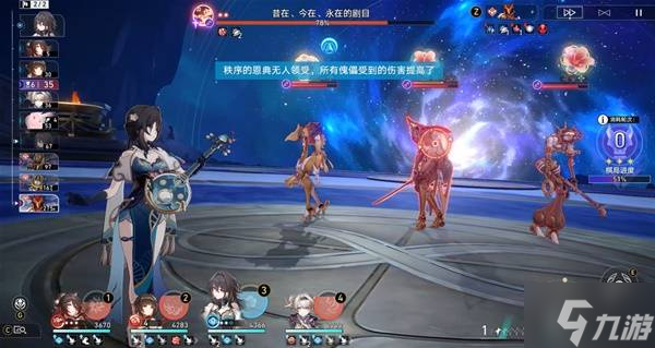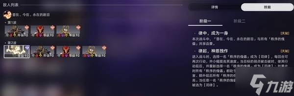 召唤【宣诫】,如下图左边行动条跑完即会释放【为同一律献舞】给我方群体施加【异梦】、【荒宴醉】、【欢宴罪】状态,此外会给傀儡解控或者恢复击破状态,如果从击破状态恢复会成为【司律】即立即行动。