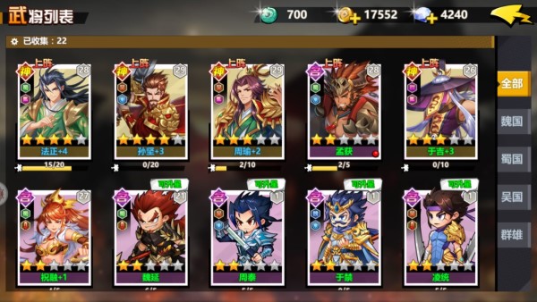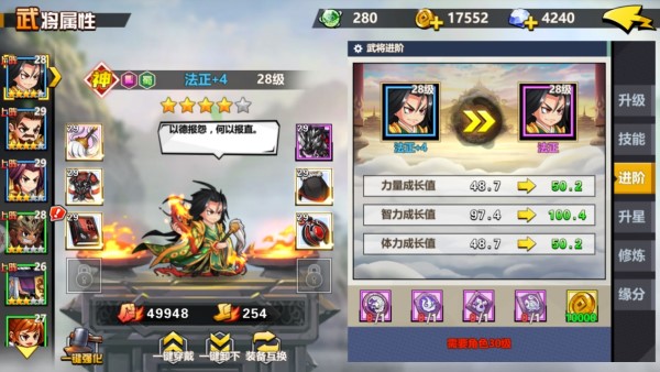 游戏中获得的武将一定要记得培养,不然战力差的会相当的多。人物可以进行升级,但是不能超过主人公的等级,另外还可以提升技能,技能点升级之后会自动获取的,所以绝对够用。升星则需要人物碎片,需要的比较多,提升一次需要十片。最有用的就是进阶,用来提升人物的品质,一旦进阶会大幅度的提升人物战力,当然,装备也不能忘记,同样很重要。