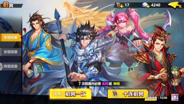 游戏中的武将都是三国中的人物,想要获得就需要去招募中啦,这里面可以获得大量的武将,而且十分帅气,招募的画面不是很华丽,但是看上去也是相当的有趣,如果有橙色武就会出现橙色的卡牌,概率相对来说还是挺高的。