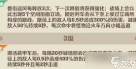 主动技能:激活装甲车后,每隔20秒城墙前会出动两列蒸汽火车,对路径上的敌人每0.5秒造成300%的伤害,且减速敌人30%,持续3秒