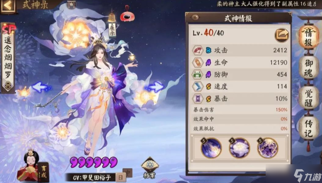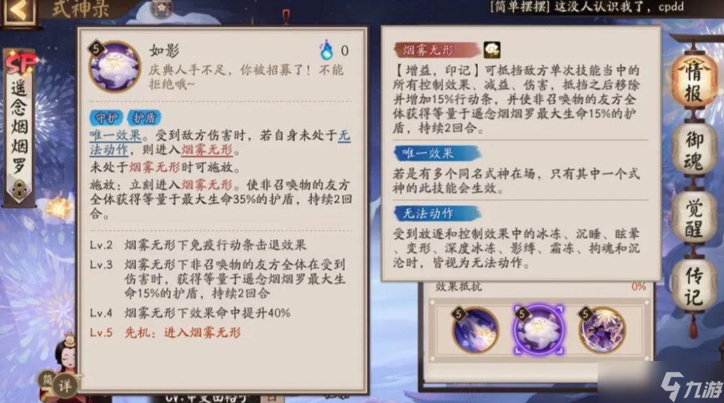 遥念烟烟罗从面板上只有暴击和速度是s级别的,但也只是基础的面板数值,作为一个sp品质的式神没有占到很大的优势。该式神的优势就是可以提供护盾和控制,是一个pvp占比比较大的式神。一技能普攻没有任何的特殊效果,就是增加一些自己的伤害而已,平时也用不到,也打不出多少伤害。二技能有被动和主动两个效果,被动时在自己受到伤害时,且自己的没有进行任何动作时,自己会进入一个烟雾无形的状态。这个状态下的烟烟罗会抵挡一次伤害、控制和减益,可以说自己处于一种无敌的状态,在抵挡一次后会退出这个状态,并给自己提高15%的行动条。