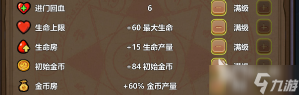初始金币加84一定要选择加点,开局就给玩家这么多的金币,那好处还是很多的,玩家就可以及时去购买装备,购买一些有用的道具就可以抢占先机。还有需要注重于加点金币房产量可以迅速的提升60%,这就意味着玩家在金币房就能有机会拿到更多的金币。在后期的游戏中,好装备还有好道具,价格都不便宜,有了这一个天赋,在赚取金币时速度也能够加快,可以有效实现金币自由。想要买什么就买什么,再也不需要因为金币而纠缠。除了这些天赋之外,也可以选择法术房或者是遗物房。