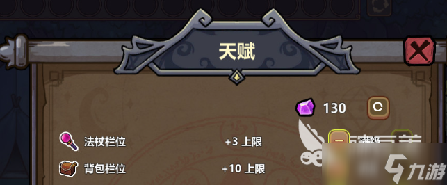 可以先看一下法杖栏位的天赋,可以直接增加三个法杖,要知道不一样的法杖所对应的魔法效果也会有所区别,多带几根法杖,那在战斗的过程中就可以灵活的切换,可以搭配出一些新奇的魔法组合。例如在打单体boss时就可以直接更换成高伤害的单体法杖,在清理小怪时就可以直接更换成范围性的法杖,战斗的策略性还是很不错的。此外在背包栏位中可以增加10个背包上限,这还是很关键的。在探索的时候就可以捡一些战利品,但是很快背包就满了,没有办法正常的使用。