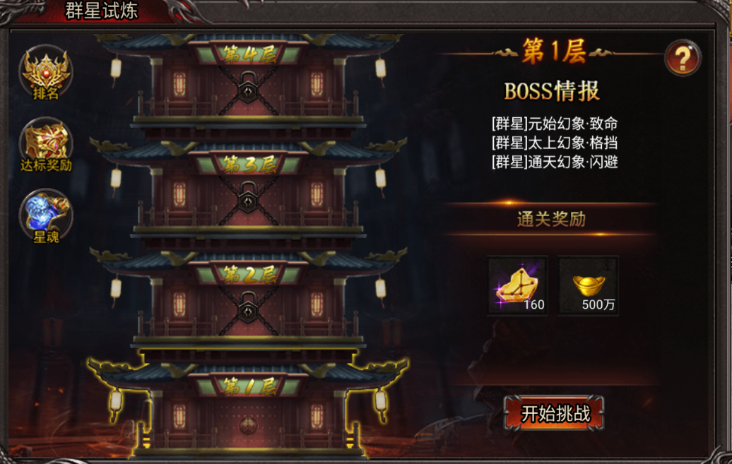 1、群星试炼为单人玩法,在规定时间内击杀本层所有BOSS即可通关,通关后可领取通关奖励;